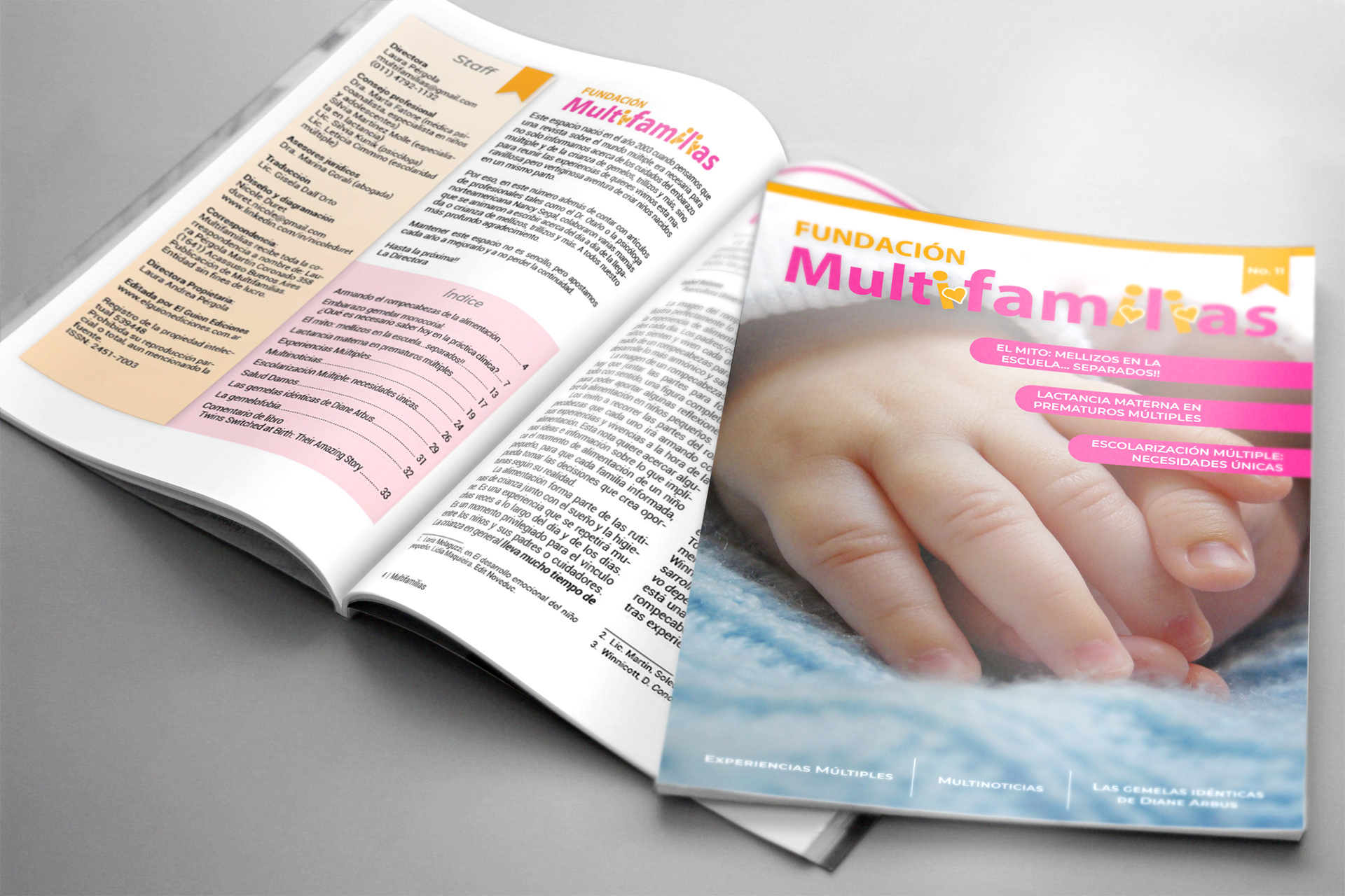 Editorial design made for Fundación Multifamilias, an NGO that aims to prevent and promote the health and quality of life of twins, triplets and more and their families. This is the finished layout and design for their magazine's 11th issue.