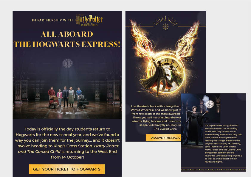 Solus email done in partnership with West End sensation Harry Potter and The Cursed Child. The dedicated email got a staggering response, with an estimated Open Rate of 23%, deriving traffic and sales to the client.